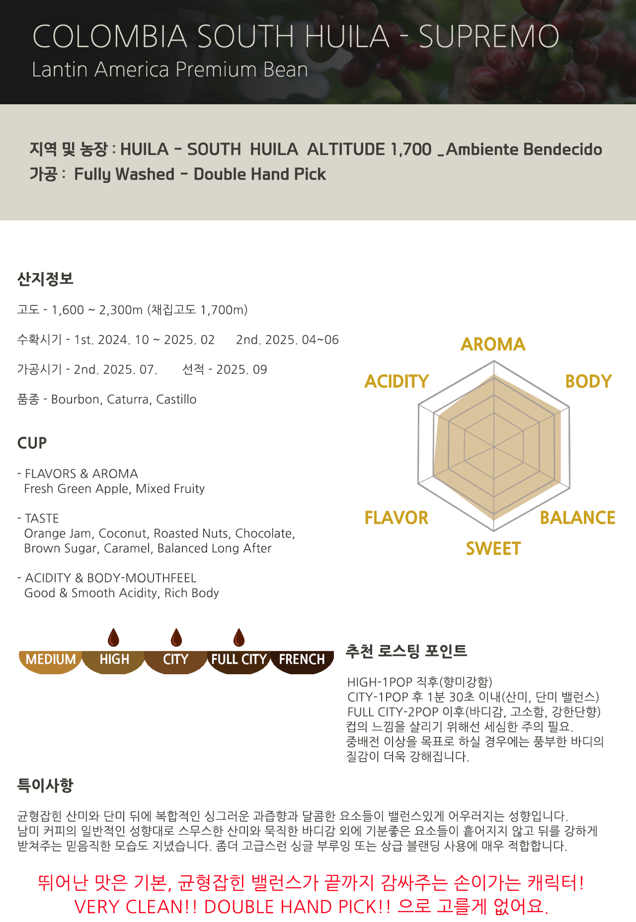 [콜롬비아] 후일라 엠비안테 벤데시도 수프리모 - 더블핸드픽 (Fully Washed) 11/26 NEW 1kg_16,700원 Score. 85.00 주문하기 본문 이전글 다음글 목록 댓글목록 댓글목록 등록된 댓글이 없습니다.